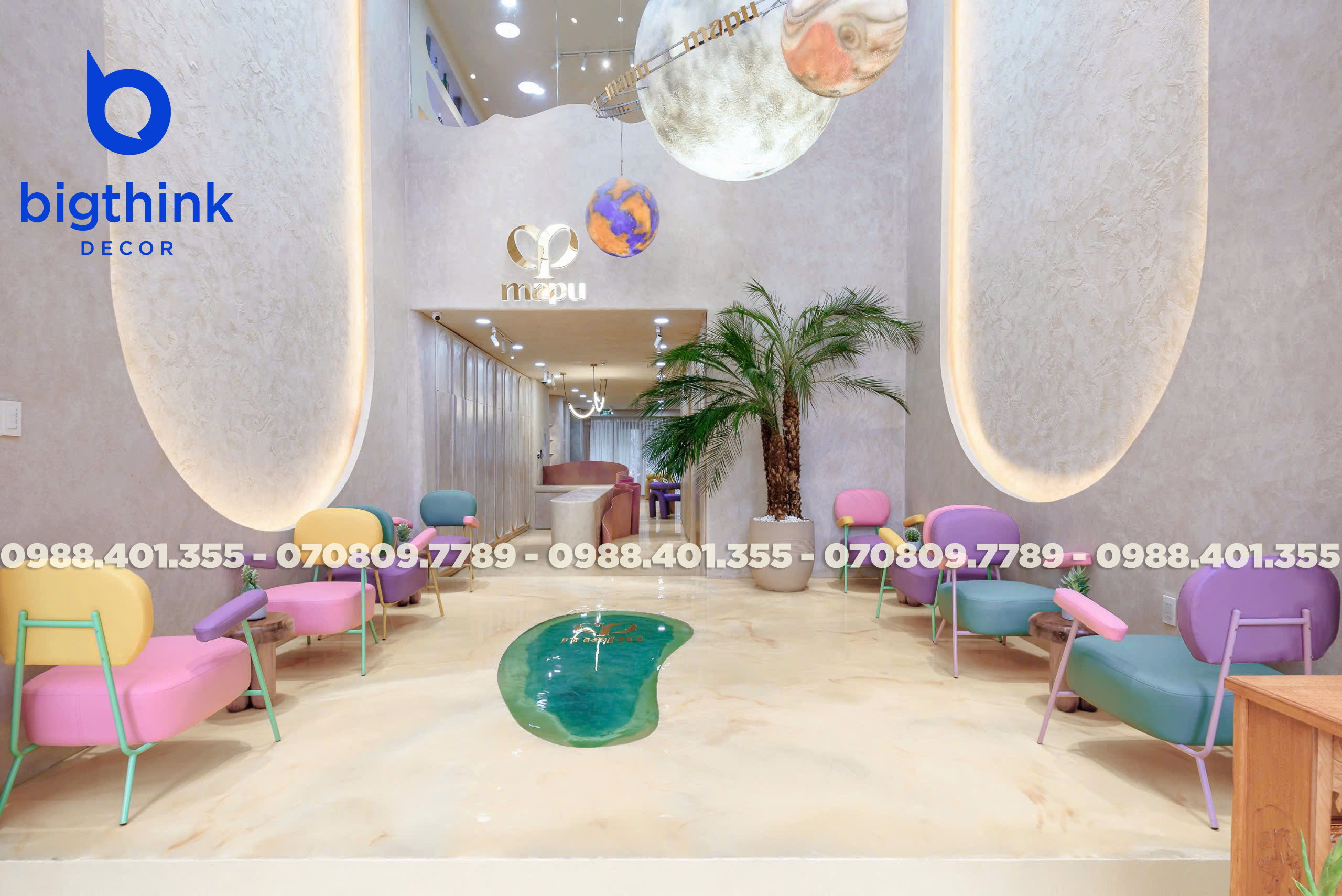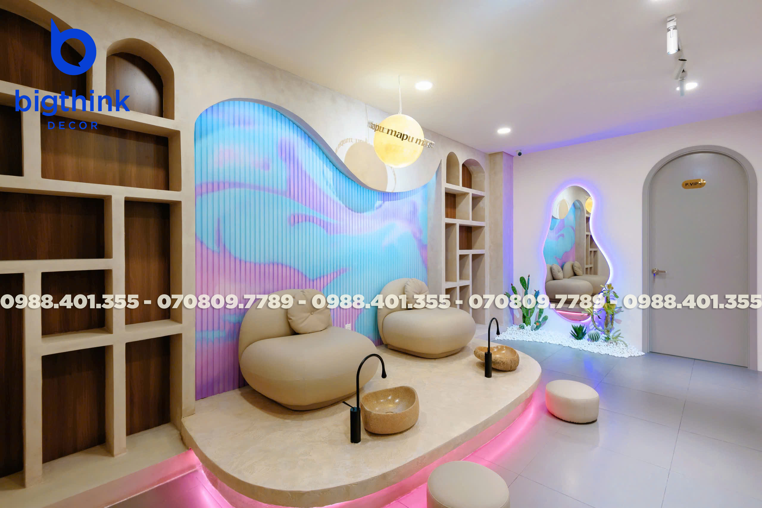Mapu Spa gây ấn tượng với không gian mang phong cách hiện đại, sáng tạo và trẻ trung, lấy cảm hứng từ những đường cong mềm mại và các chi tiết trang trí mang hơi hướng vũ trụ. Bảng màu pastel được phối khéo léo giữa tím, xanh, vàng và be sáng, tạo cảm giác vừa mới mẻ, vừa thư giãn mà không bị nặng nề.