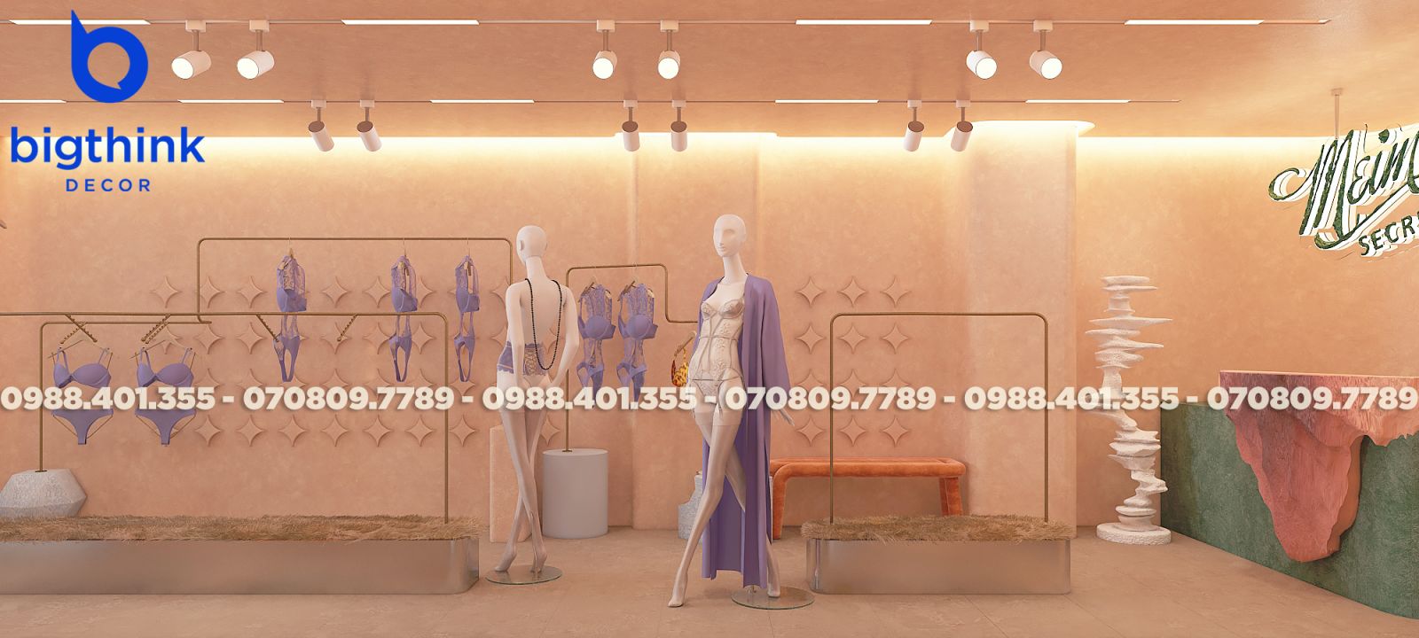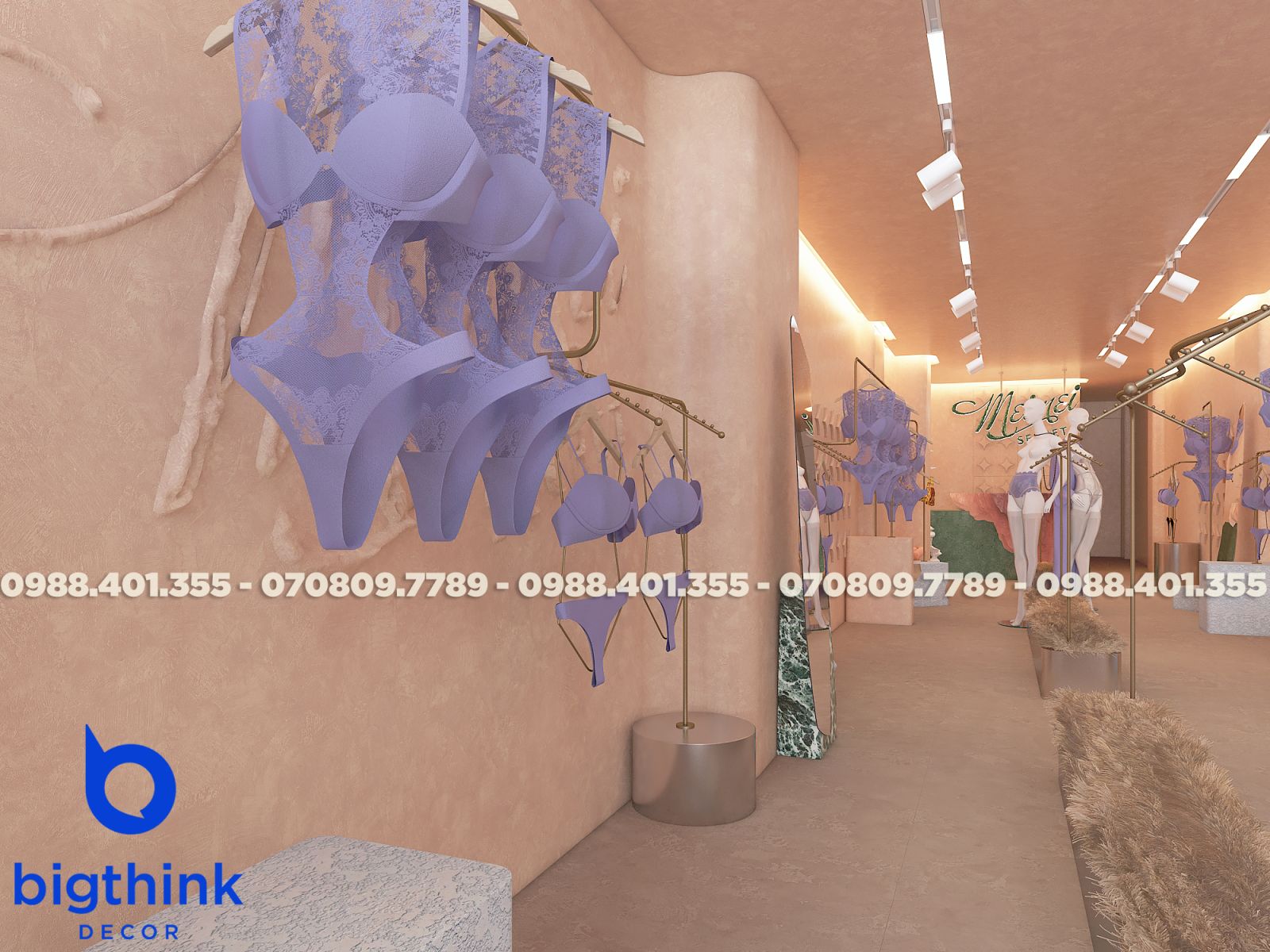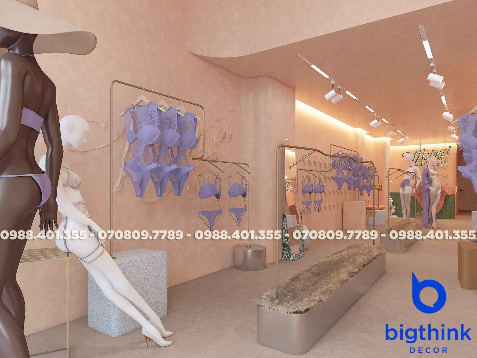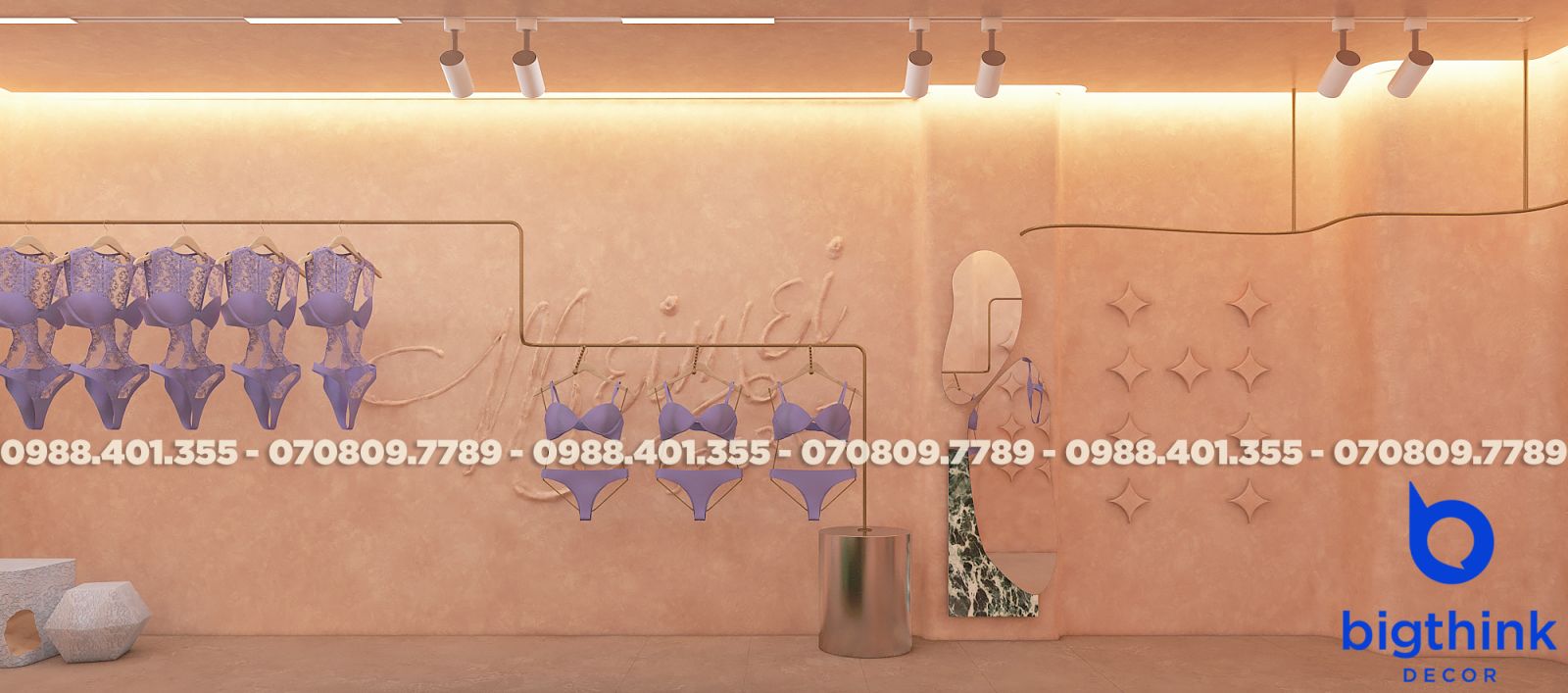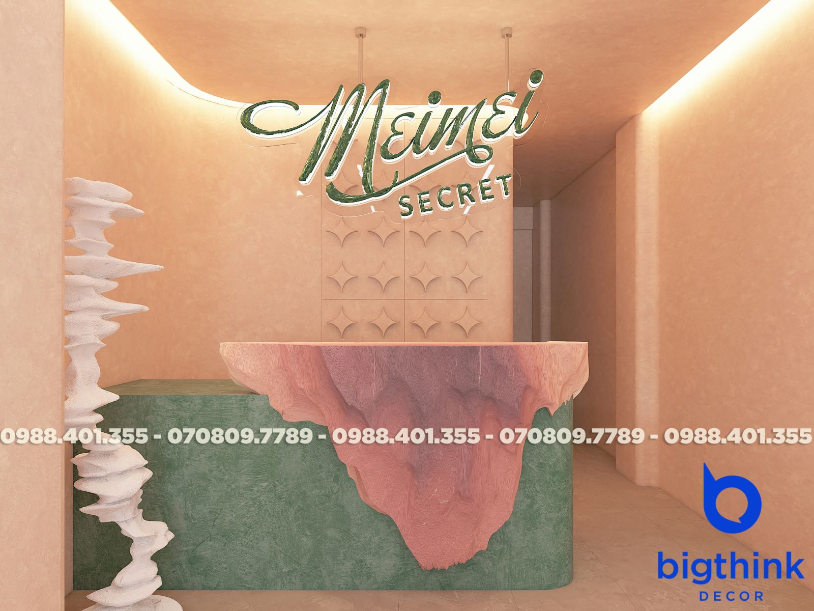 Mei Mei Secret được Bigthink Decor phát triển với định hướng tinh tế và chỉnh chu, sử dụng bảng màu nude ấm kết hợp ánh sáng dịu để tạo cảm giác riêng tư và mềm mại. Các đường cong trong không gian được xử lý tiết chế, giúp tổng thể nhẹ nhàng nhưng vẫn có chiều sâu.