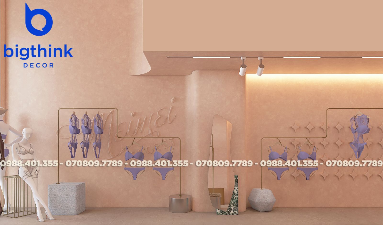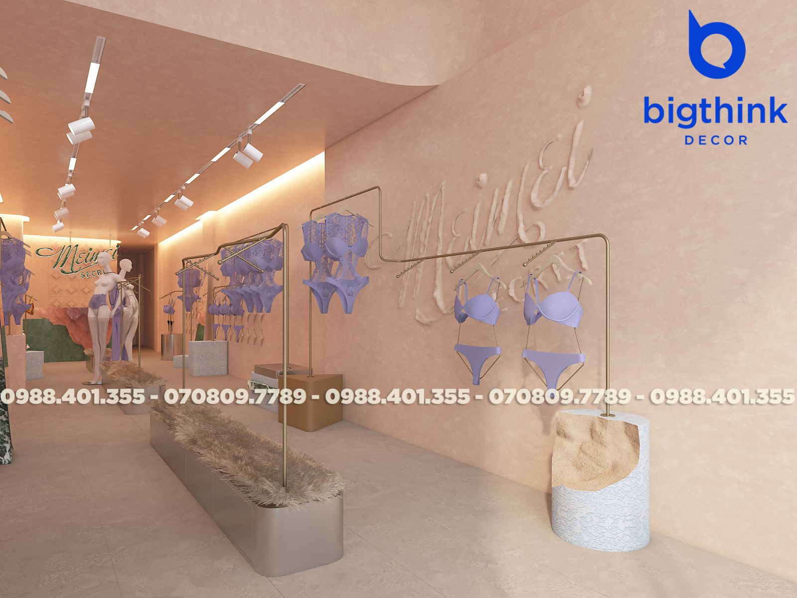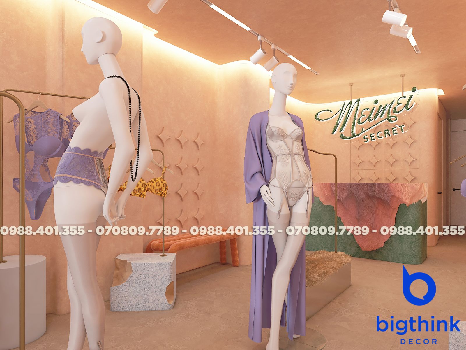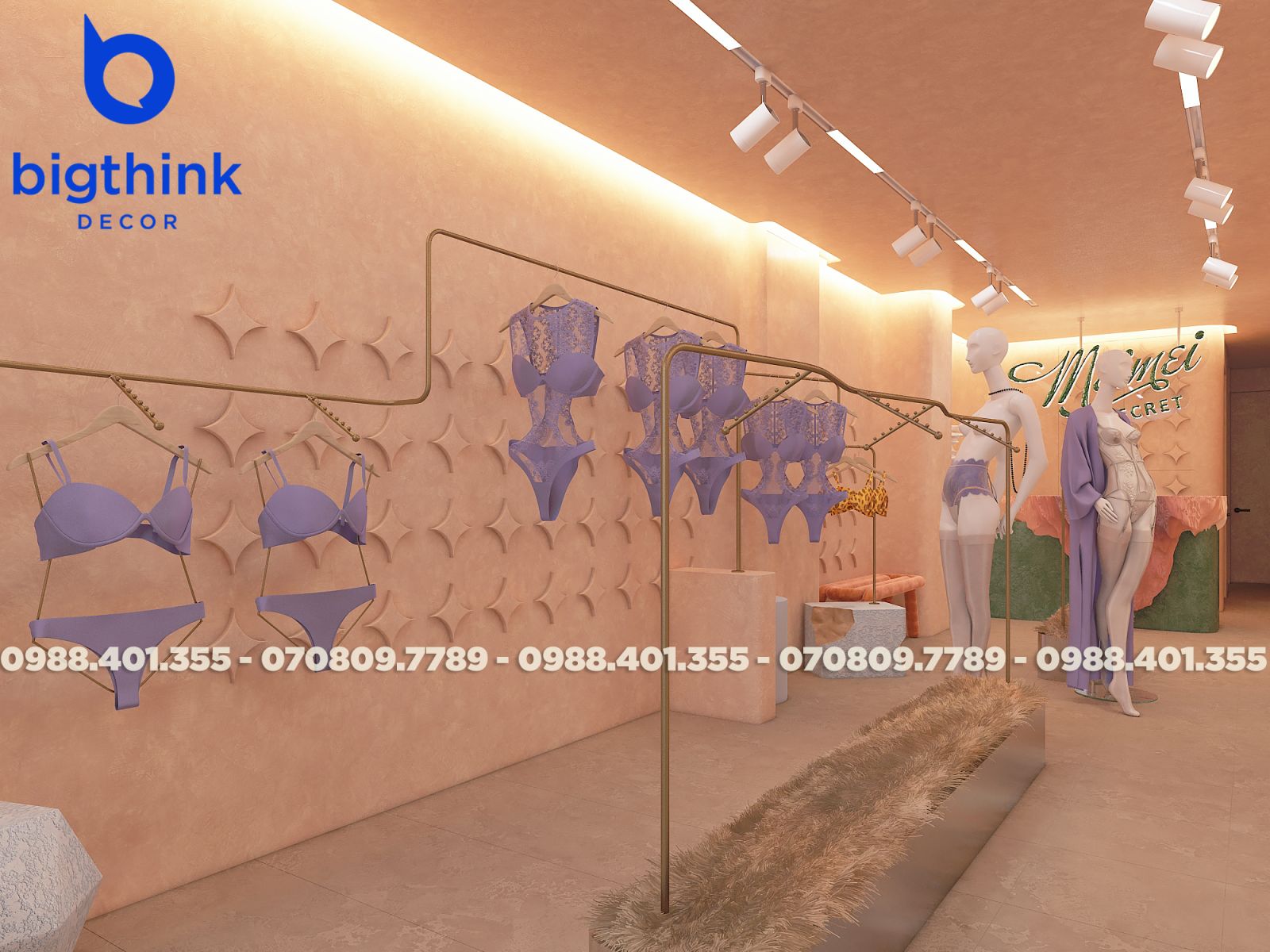 Mei Mei Secret được Bigthink Decor phát triển với định hướng tinh tế và chỉnh chu, sử dụng bảng màu nude ấm kết hợp ánh sáng dịu để tạo cảm giác riêng tư và mềm mại. Các đường cong trong không gian được xử lý tiết chế, giúp tổng thể nhẹ nhàng nhưng vẫn có chiều sâu.