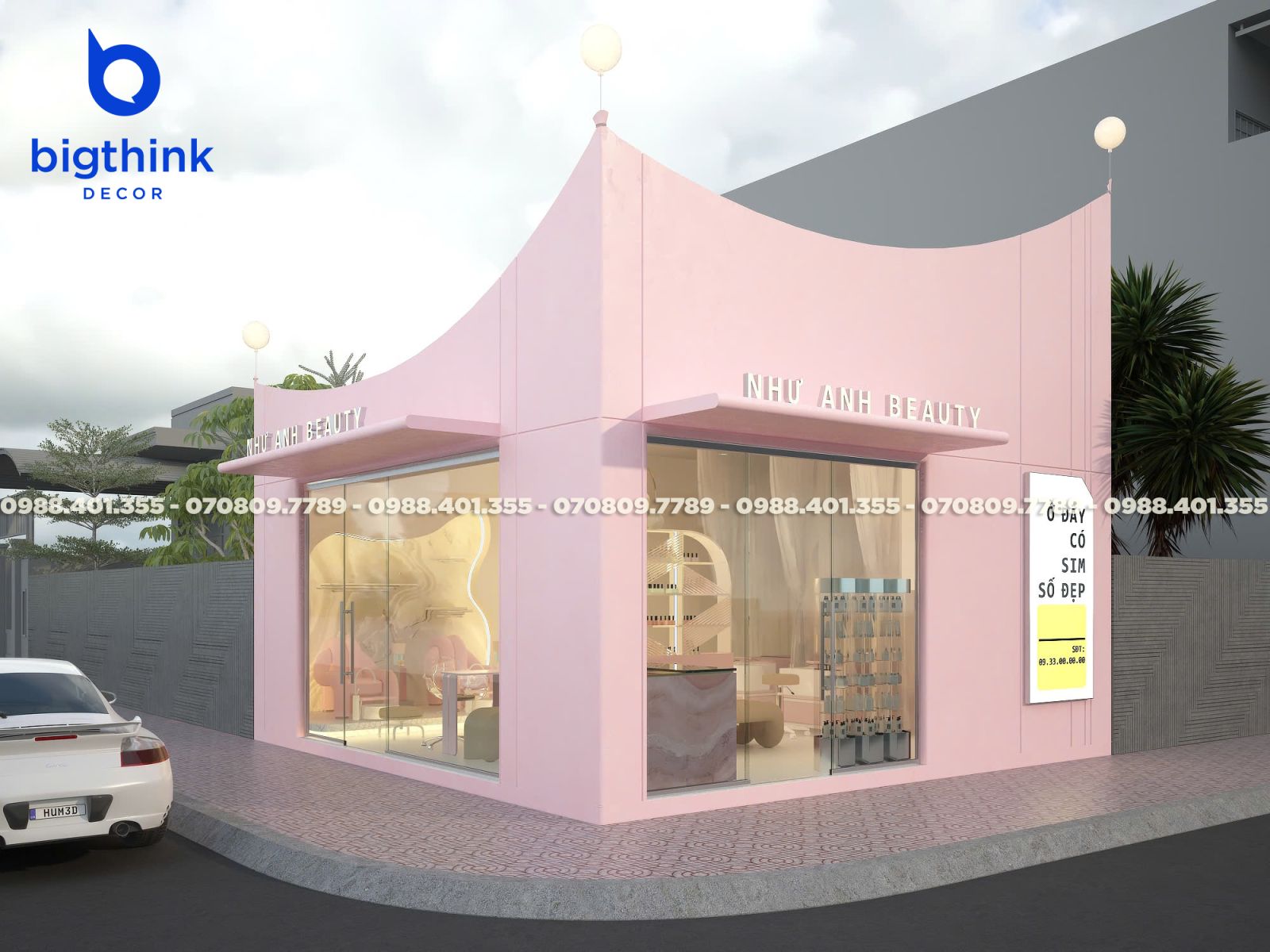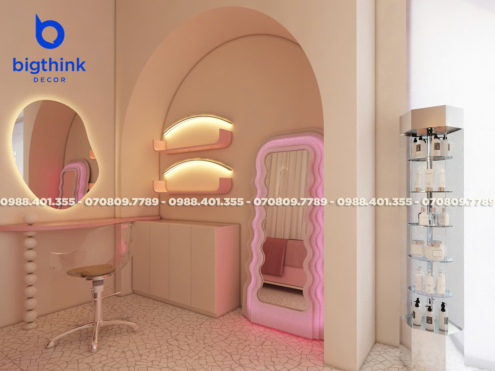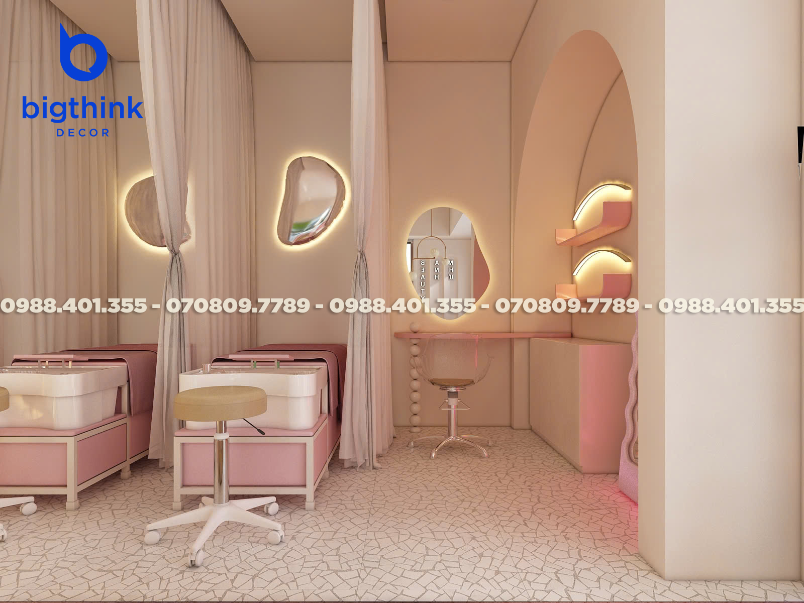 Như Anh Beauty mang phong cách sang trọng, tinh tế và đậm dấu ấn cá nhân. Không gian nổi bật với tông hồng pastel nhẹ nhàng, kết hợp ánh sáng vàng ấm áp, tạo cảm giác dịu mắt và thân thiện.