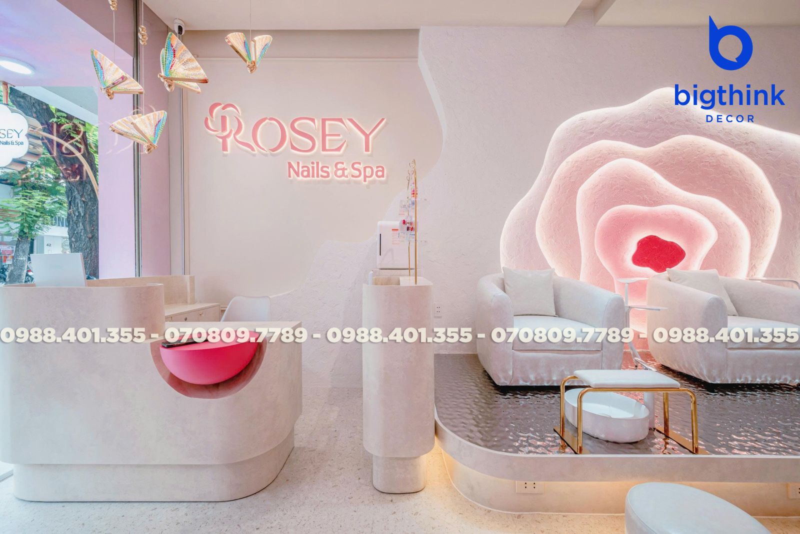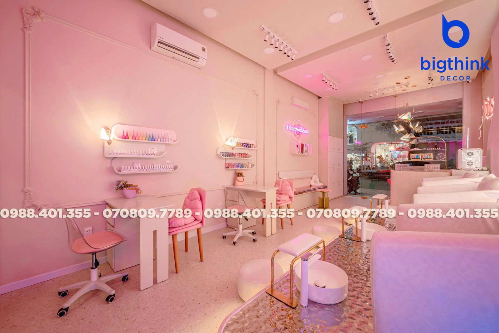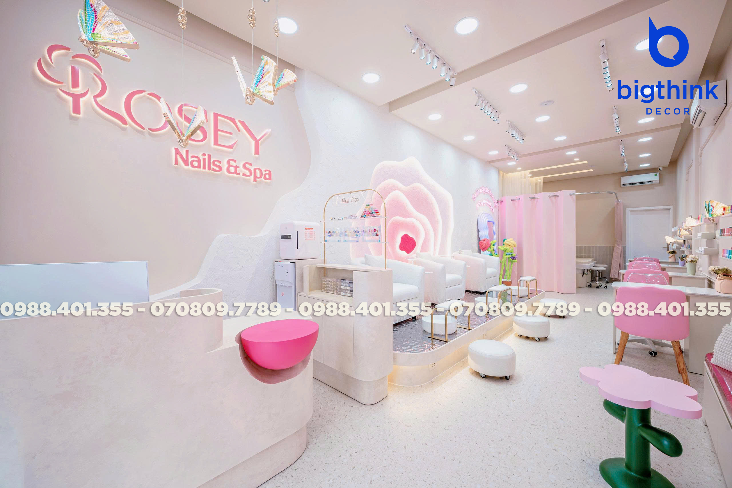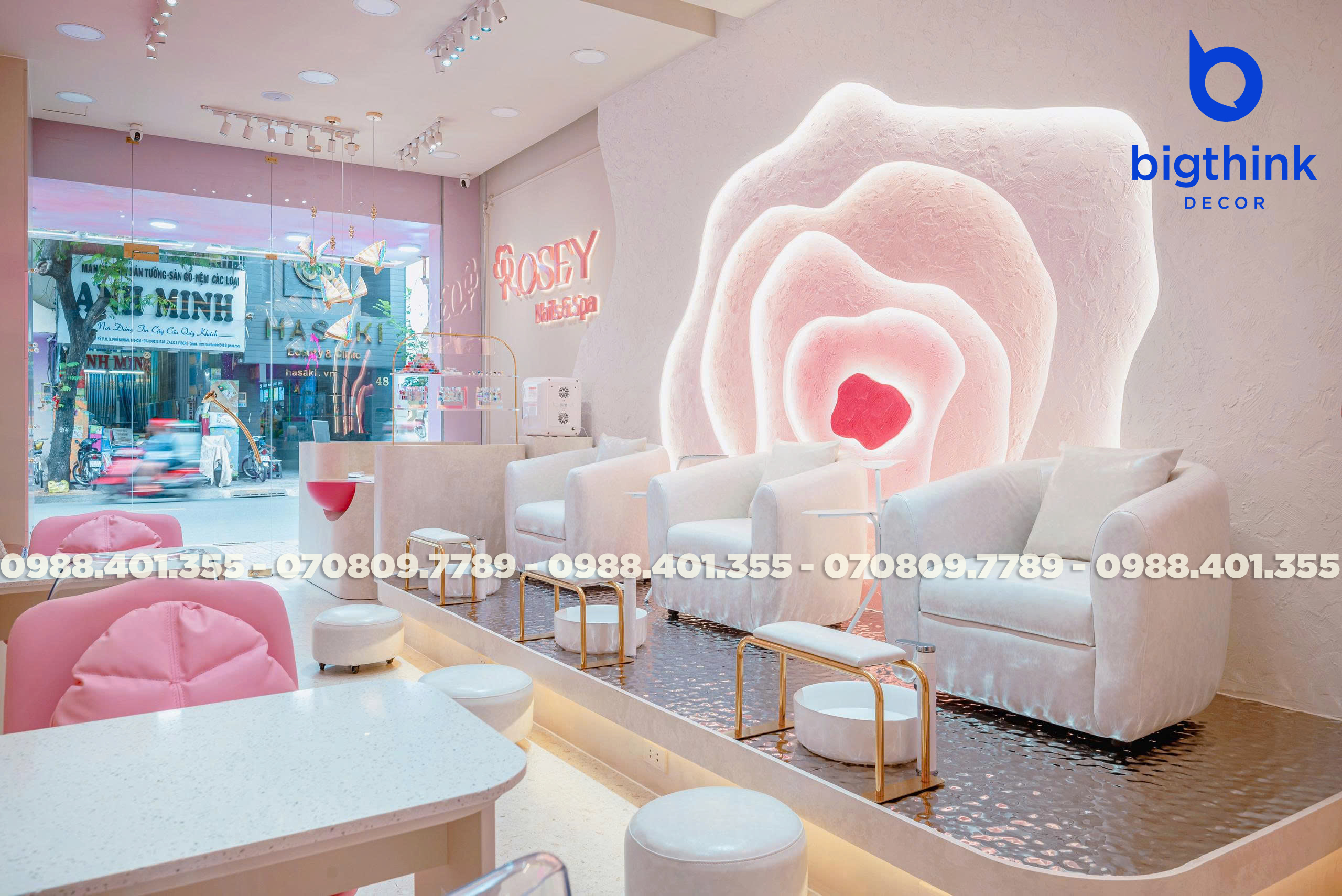 Rosey Nail & Spa được thiết kế theo hướng nhẹ nhàng và hiện đại, tạo cảm giác thoải mái ngay khi khách bước vào. Không gian được chia tách mạch lạc, từng khu vực đều có vai trò rõ ràng: khu làm móng, ghế chờ, quầy lễ tân cho đến góc thư giãn đều được sắp xếp khoa học để đảm bảo sự tiện lợi trong vận hành.