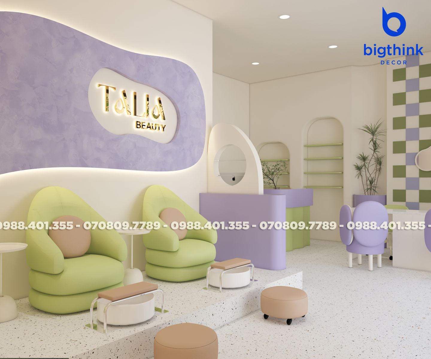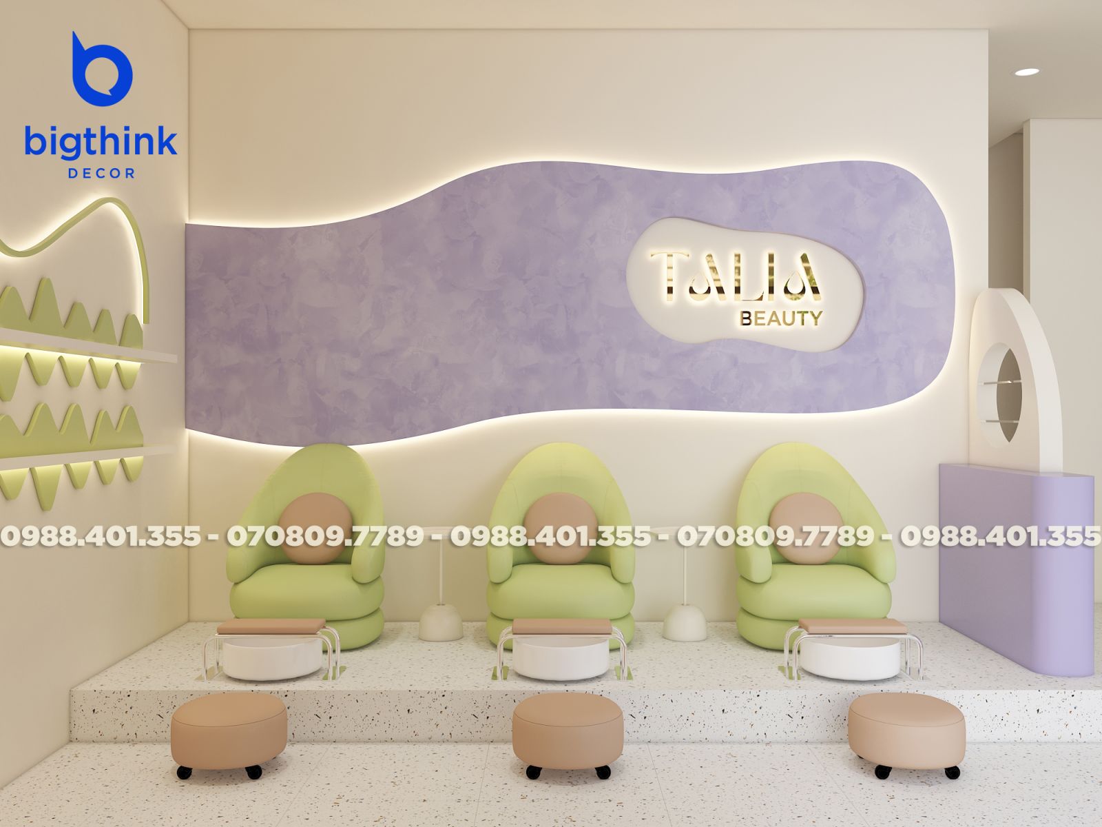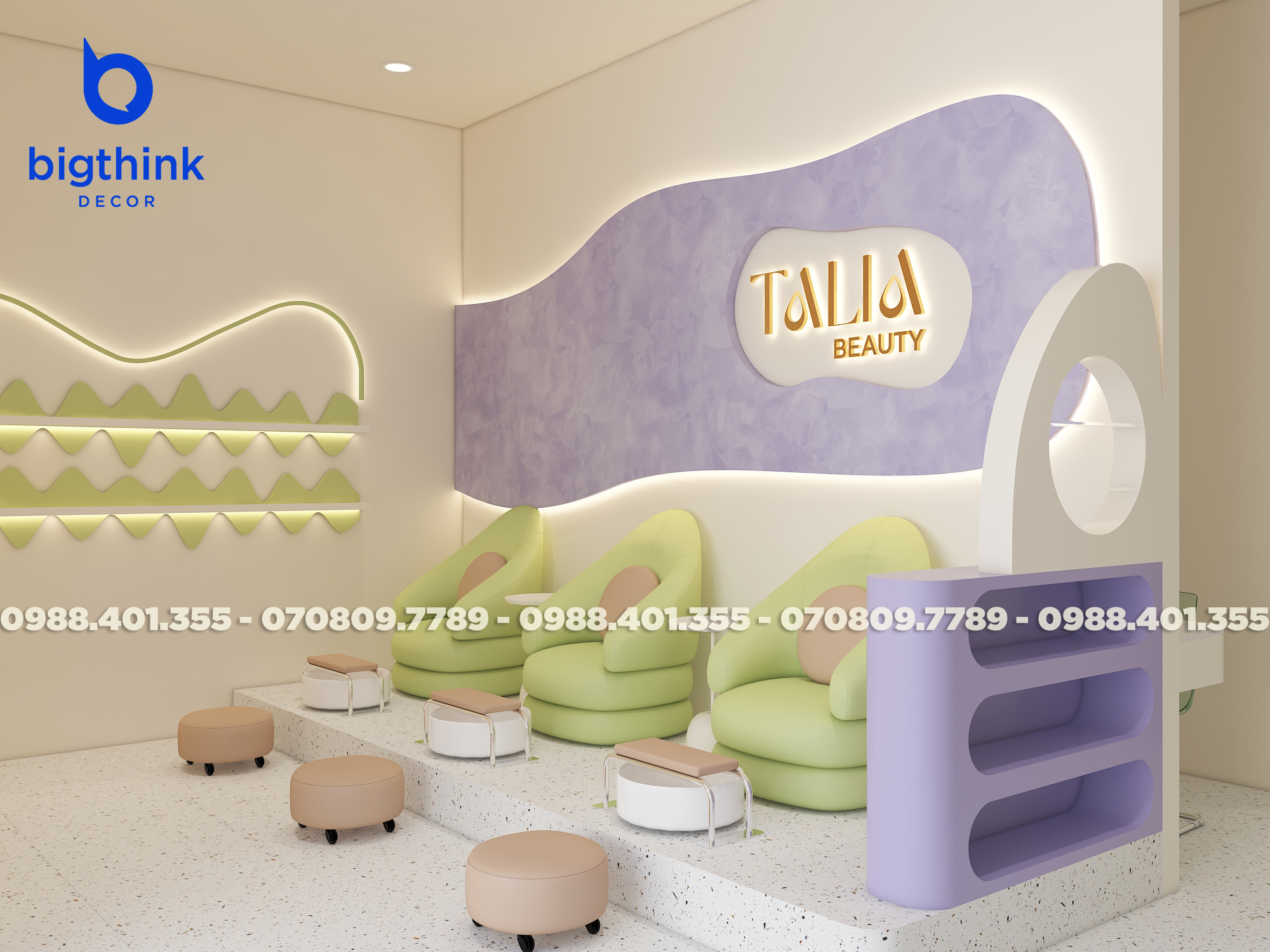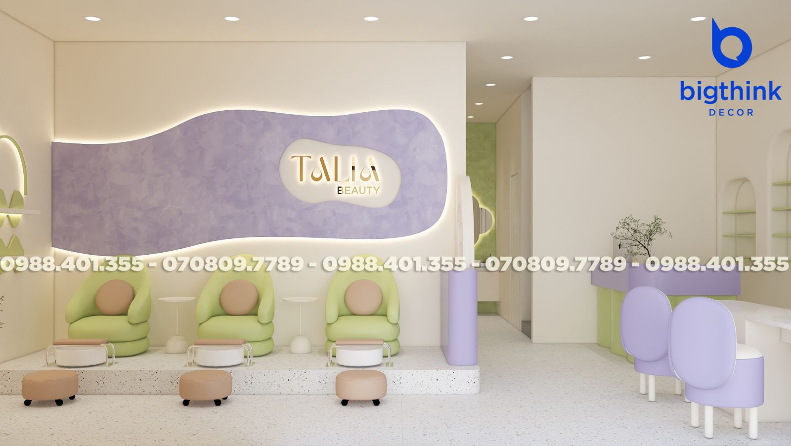 Talia Beauty được xây dựng với mục tiêu tạo ra một không gian nhẹ nhàng nhưng vẫn có điểm nhấn riêng. Các mảng cong, ánh sáng ấm và bảng màu pastel giúp tổng thể trở nên mềm mại, dễ chịu. Khu làm móng, khu lễ tân và khu ngồi chờ được phân chia rõ ràng nhưng vẫn liên kết, đảm bảo trải nghiệm liền mạch cho cả chủ tiệm lẫn khách hàng.