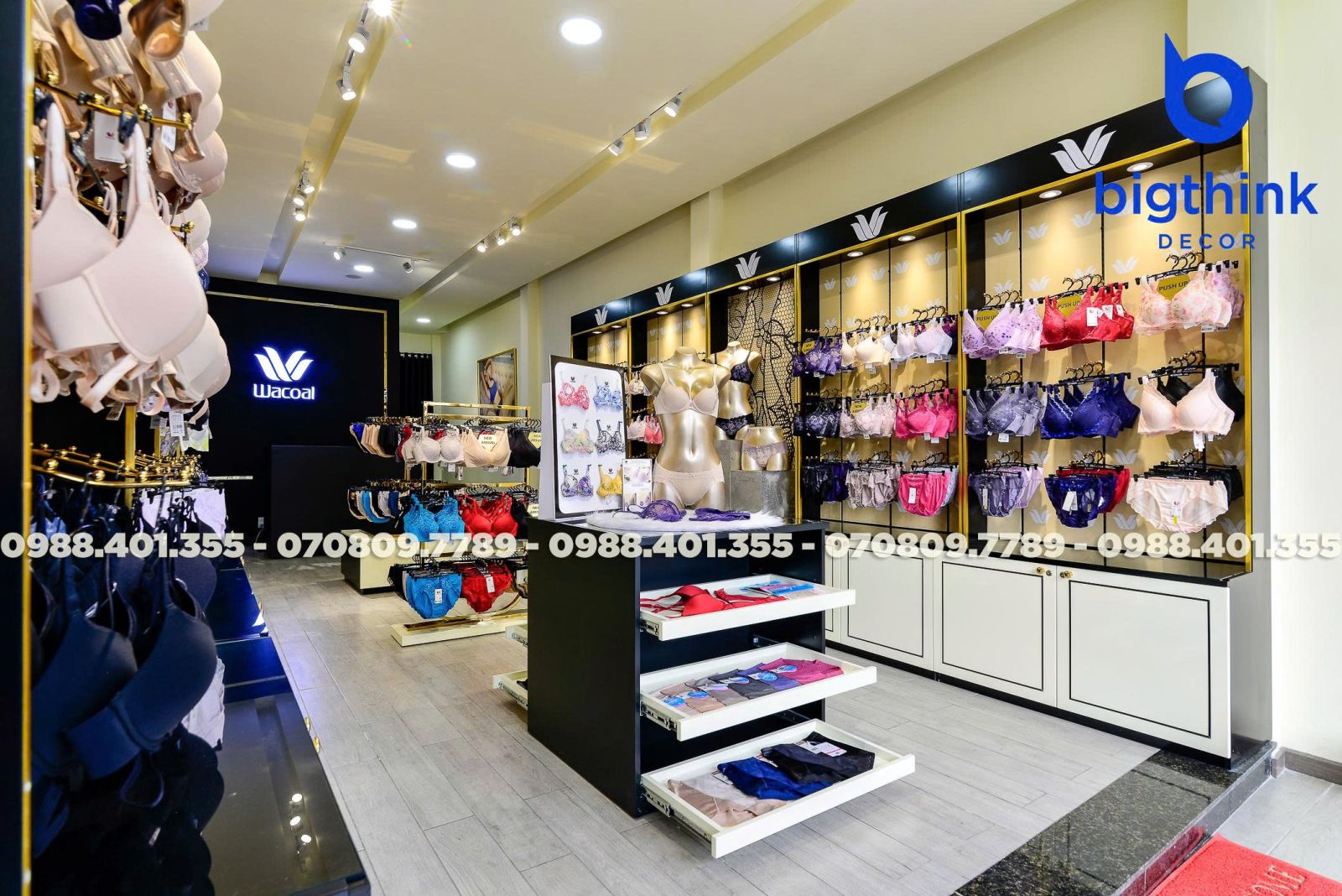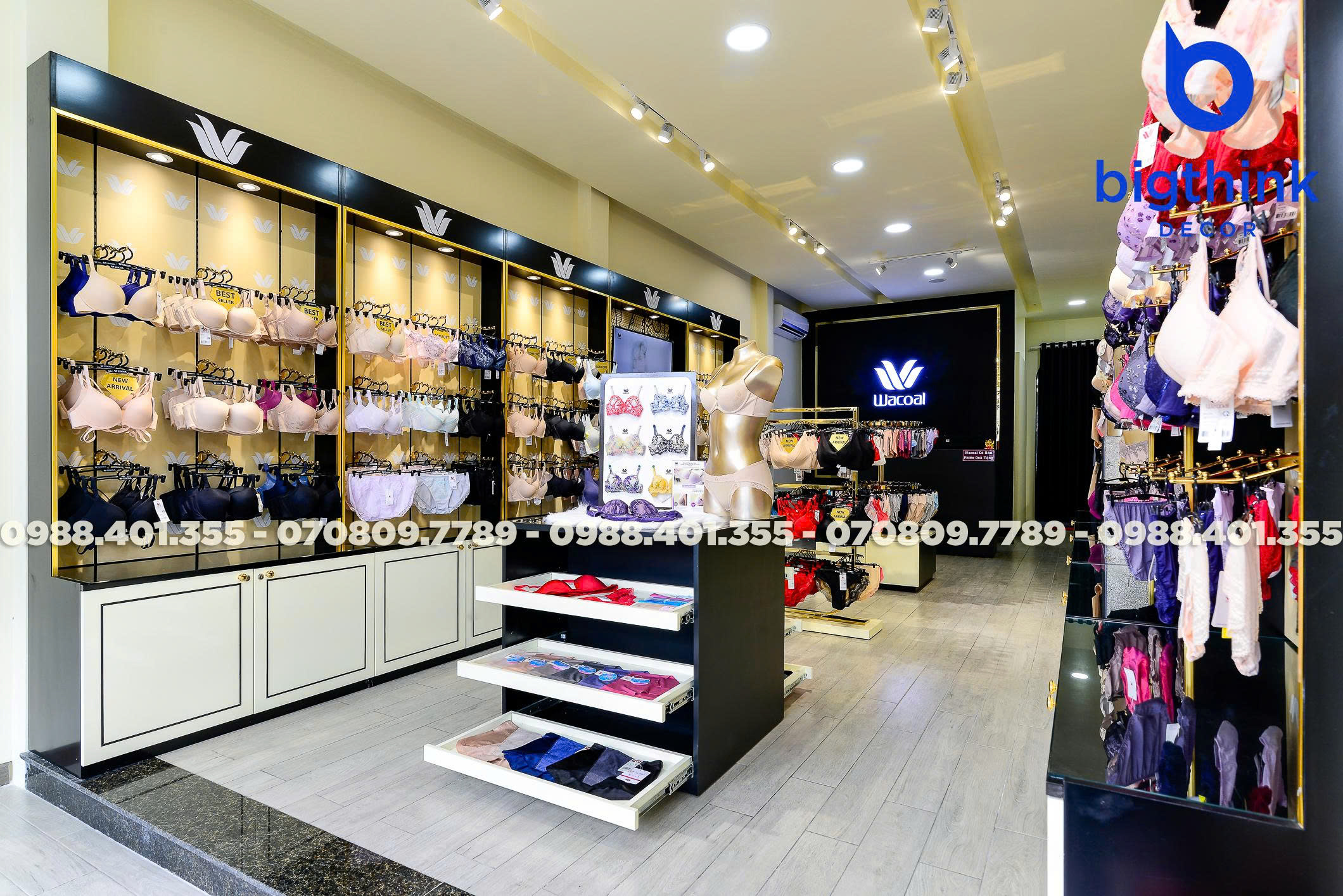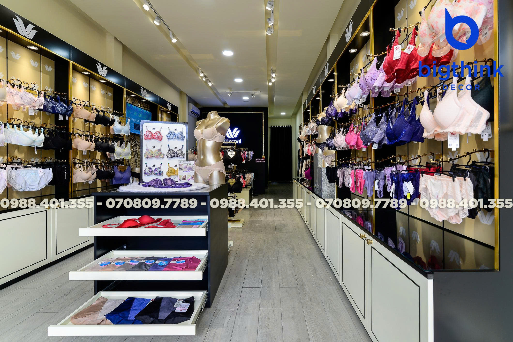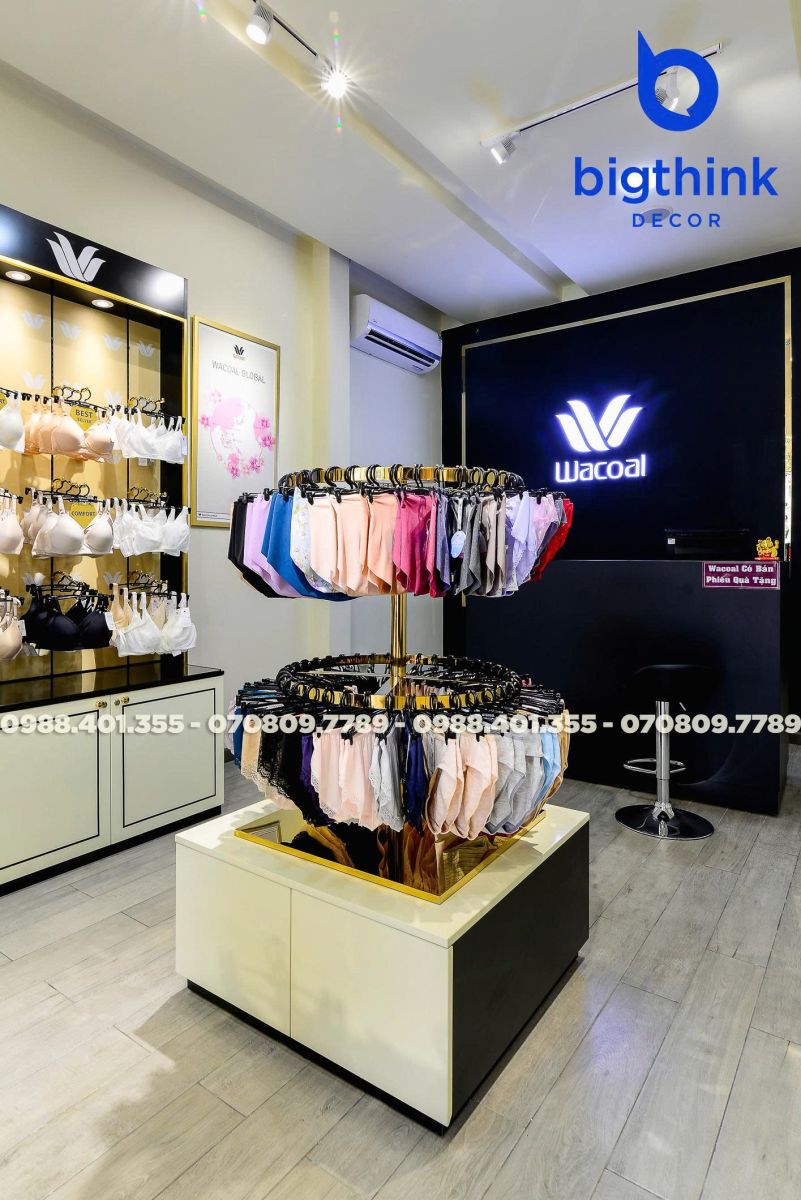 Cửa hàng Wacoal tại Quang Trung là minh chứng cho sự chỉn chu trong từng chi tiết nội thất từ Bigthink Decor. Không gian được thiết kế và hoàn thiện nhằm mang lại trải nghiệm mua sắm sang trọng, thoải mái nhất cho khách hàng.
